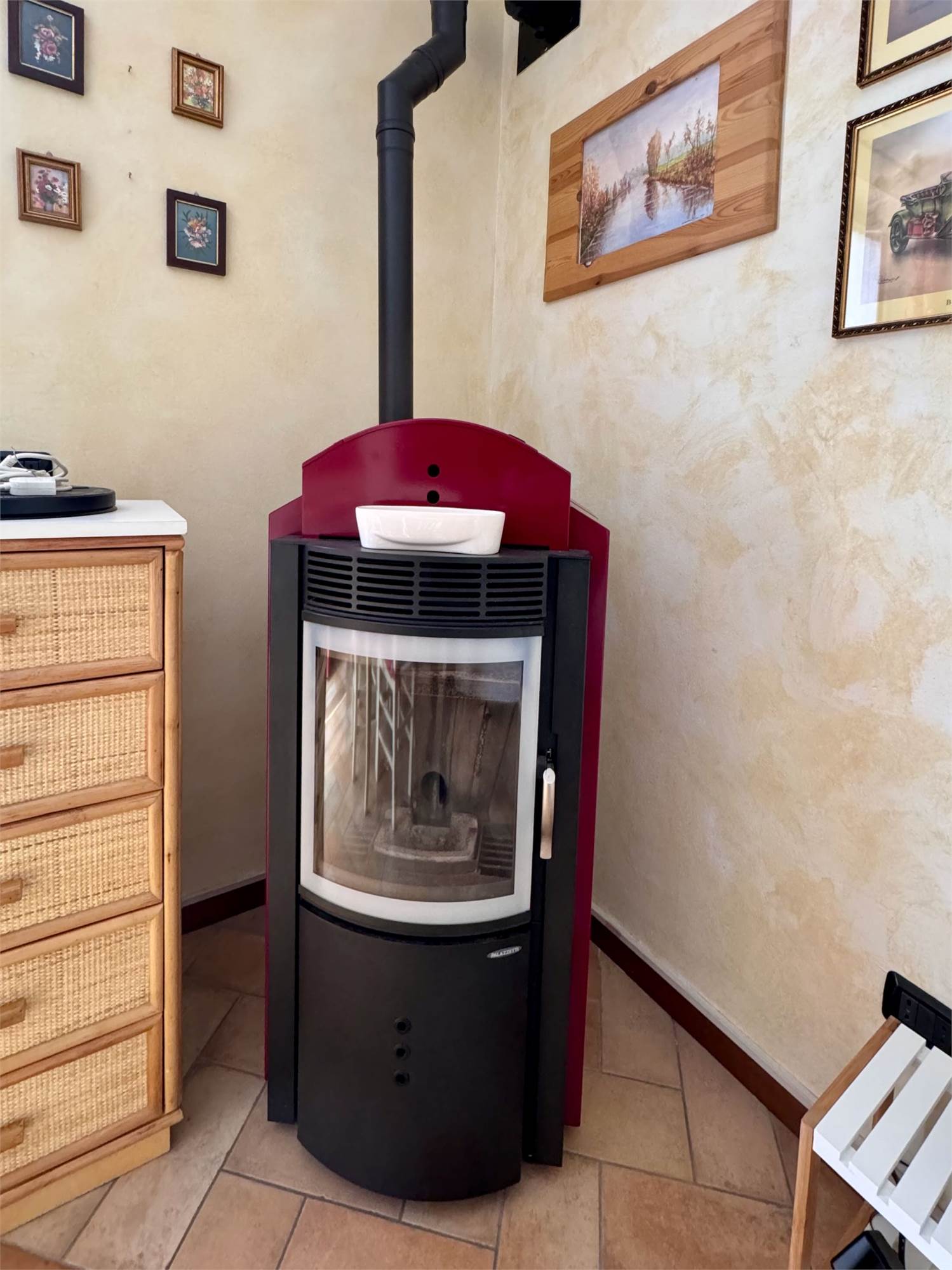 La stufa a pellet offre un'opzione ecologica e efficiente per il riscaldamento, mentre i termosifoni assicurano una distribuzione uniforme del calore per una temperatura piacevole e costante.