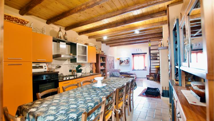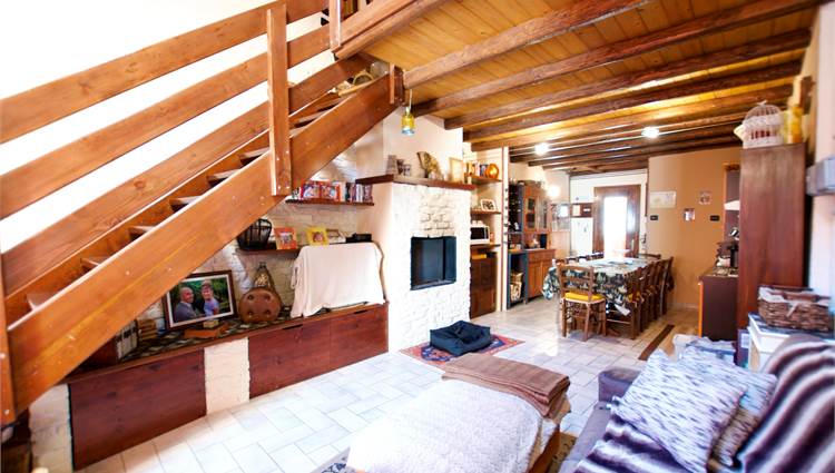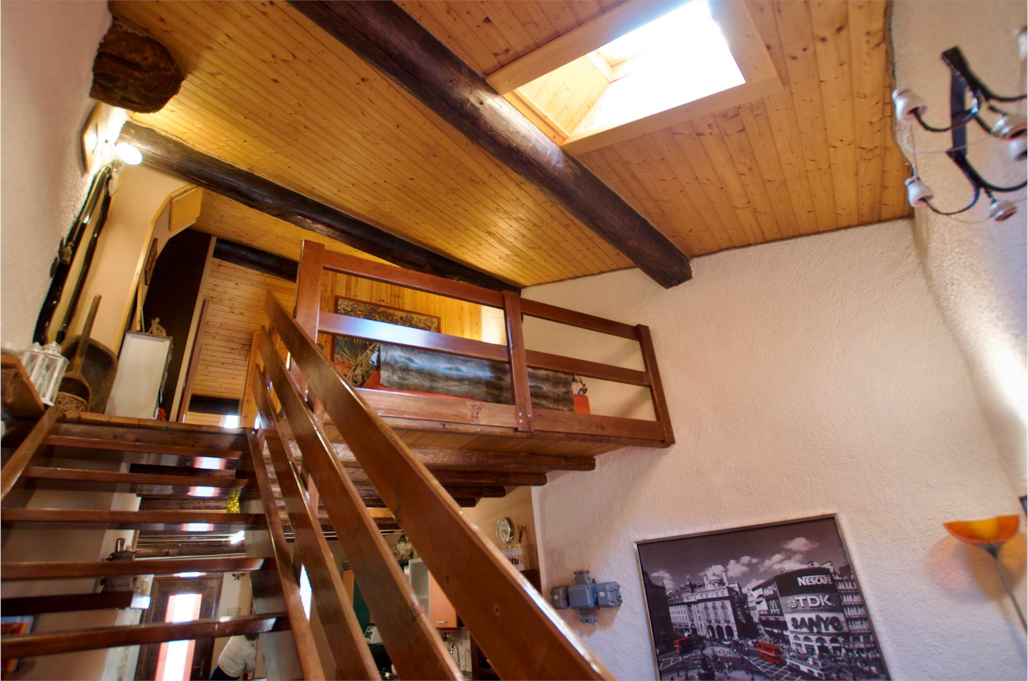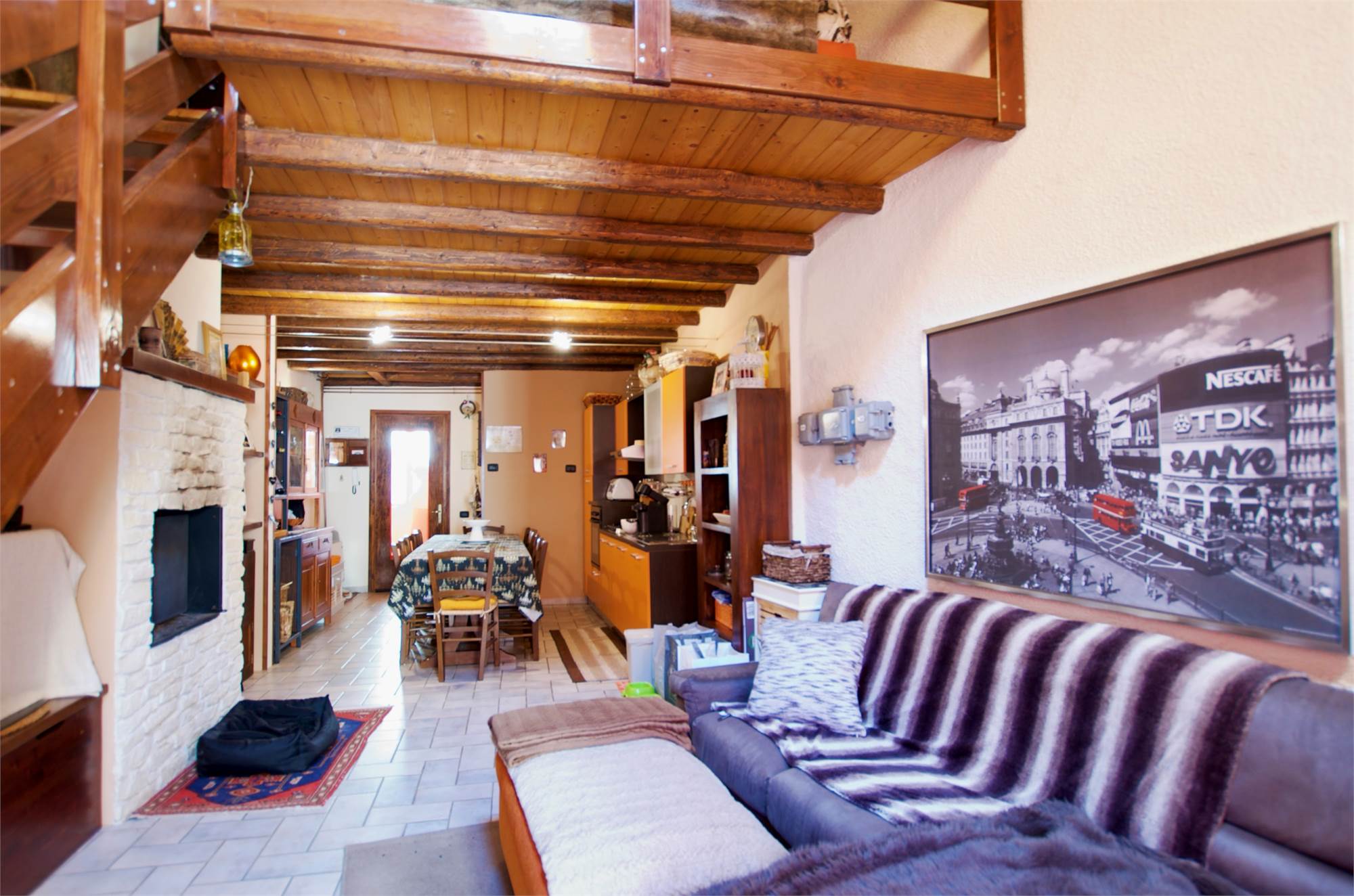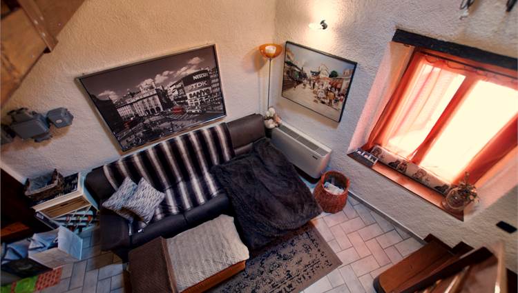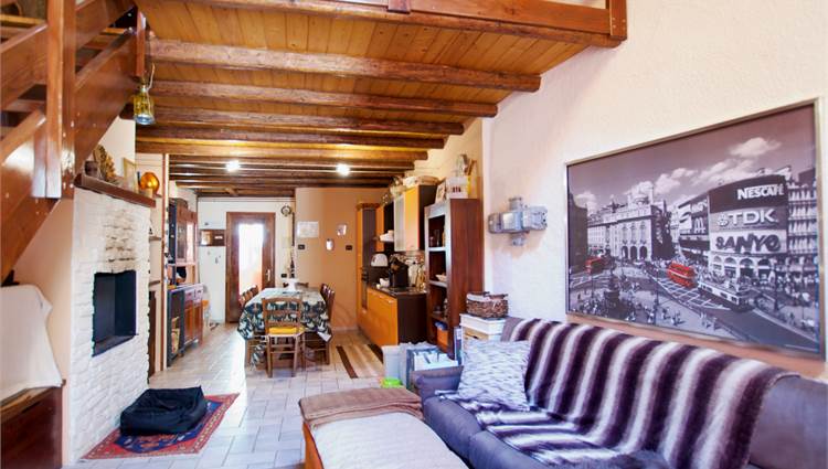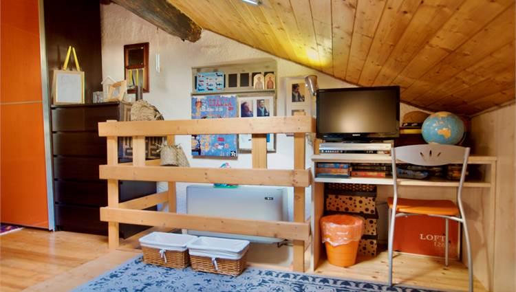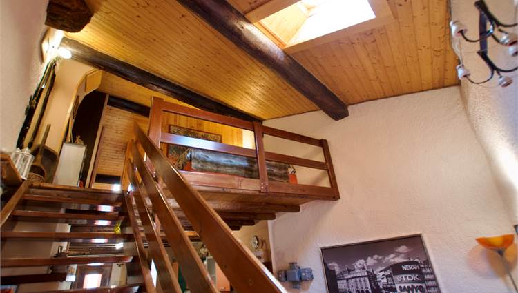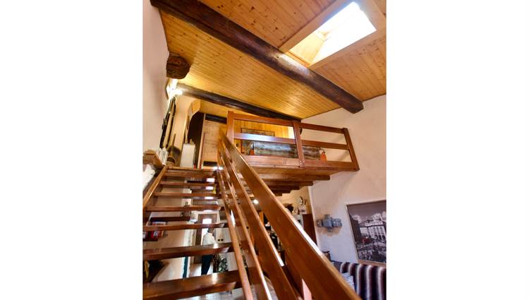 La zona giorno si sviluppa in un ampio e luminoso open space, dove cucina e soggiorno convivono in un’atmosfera accogliente e conviviale, perfetta per momenti di relax o serate in compagnia, servita da un bagno. Una scenografica scala in legno conduce al soppalco, dove si apre una zona notte dal carattere unico: due camere delimitate da eleganti pareti in legno, intime e suggestive, che esaltano l’anima storica dell’edificio.