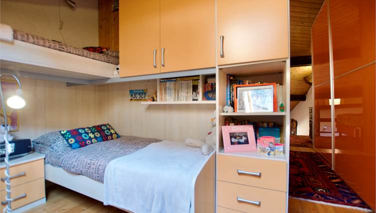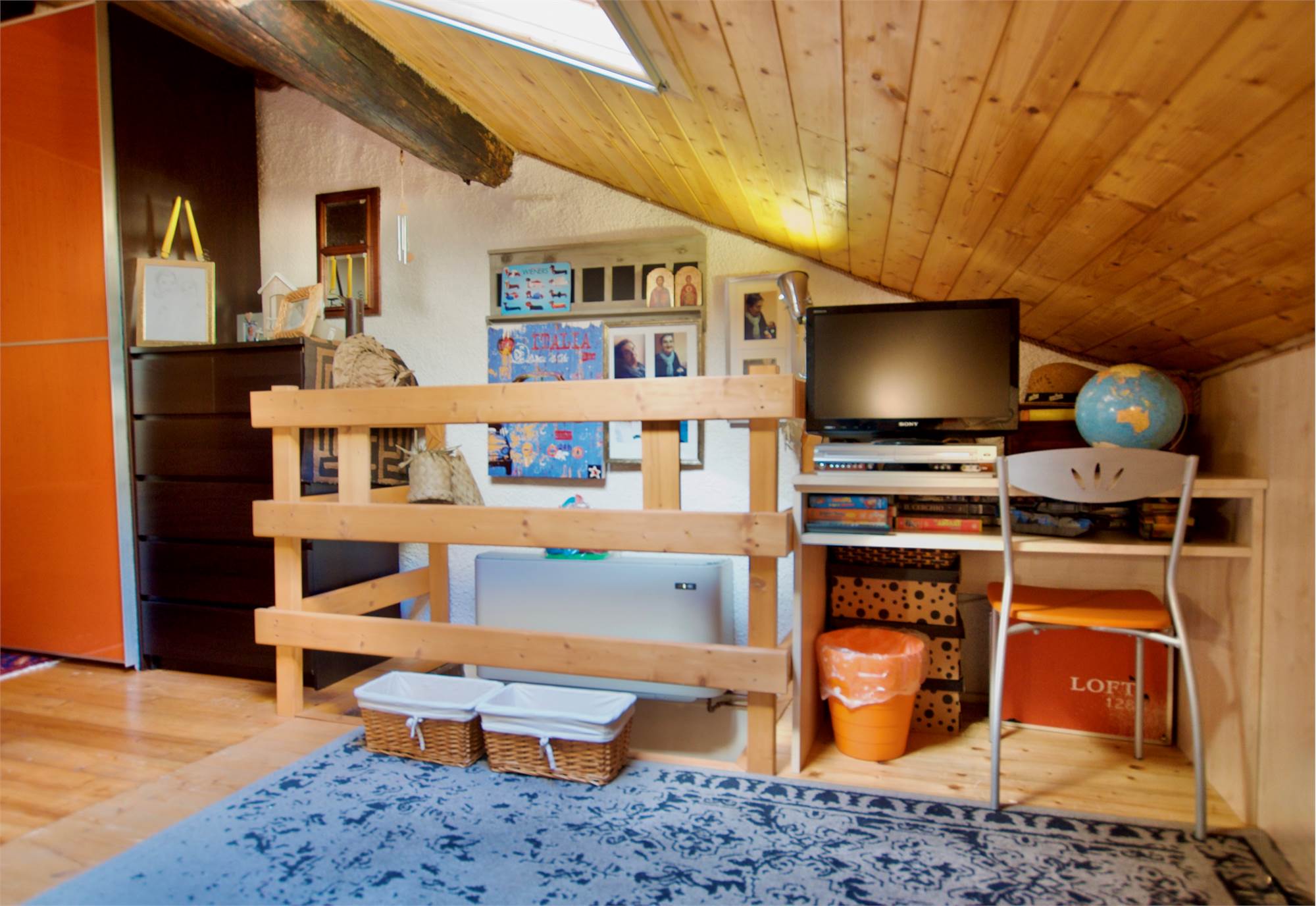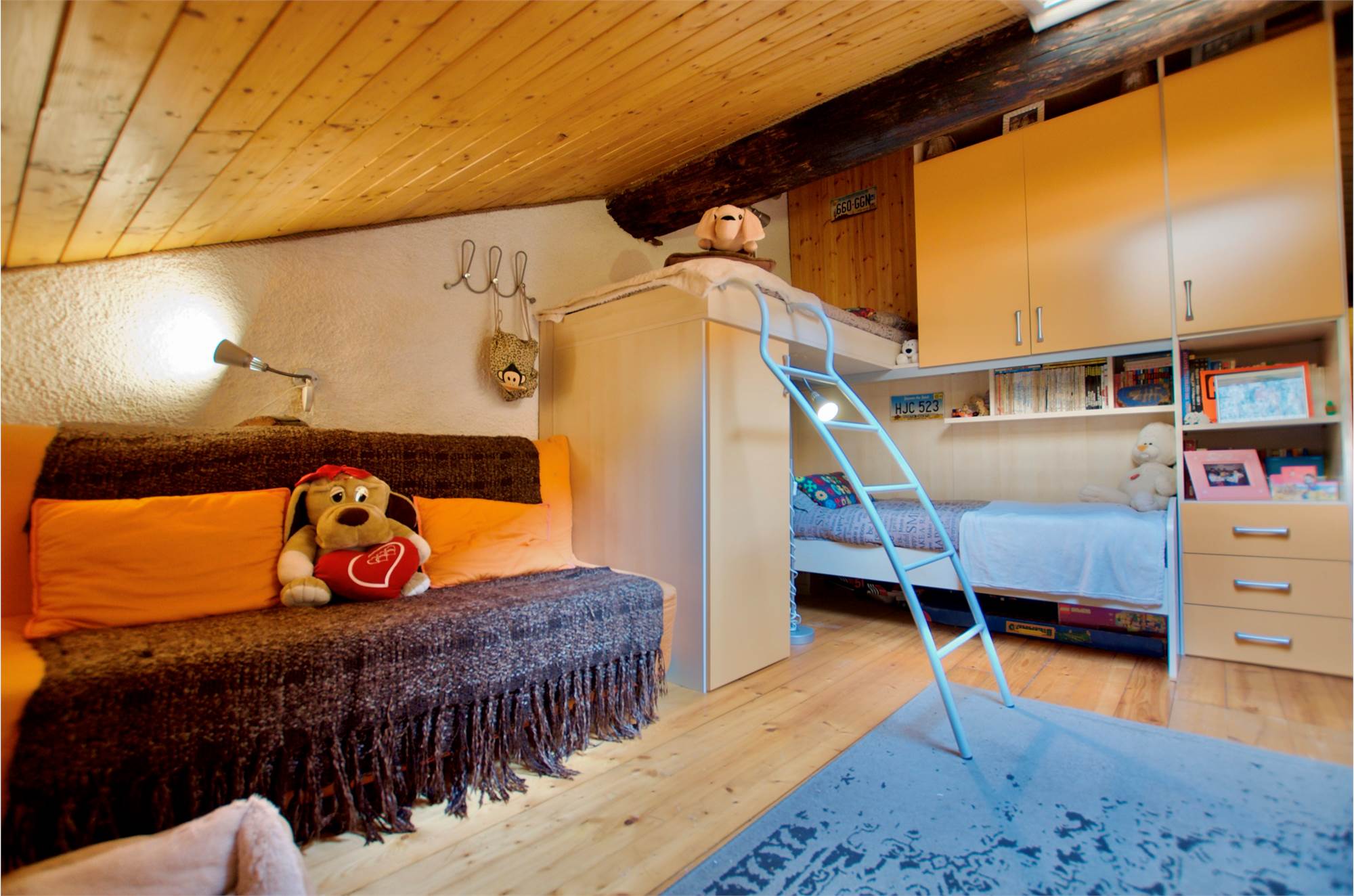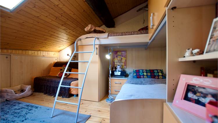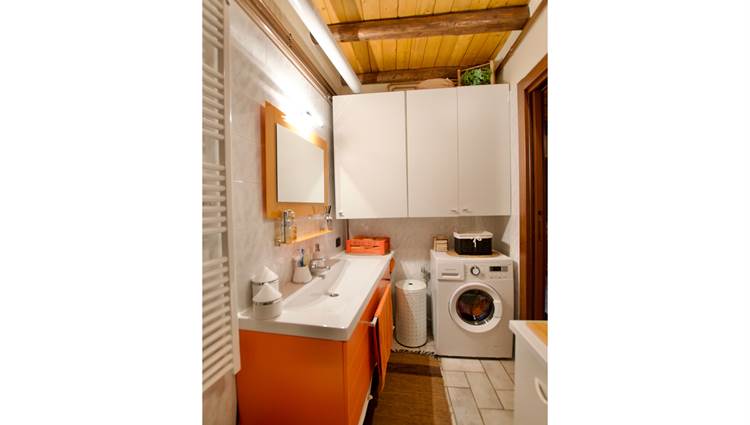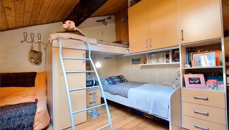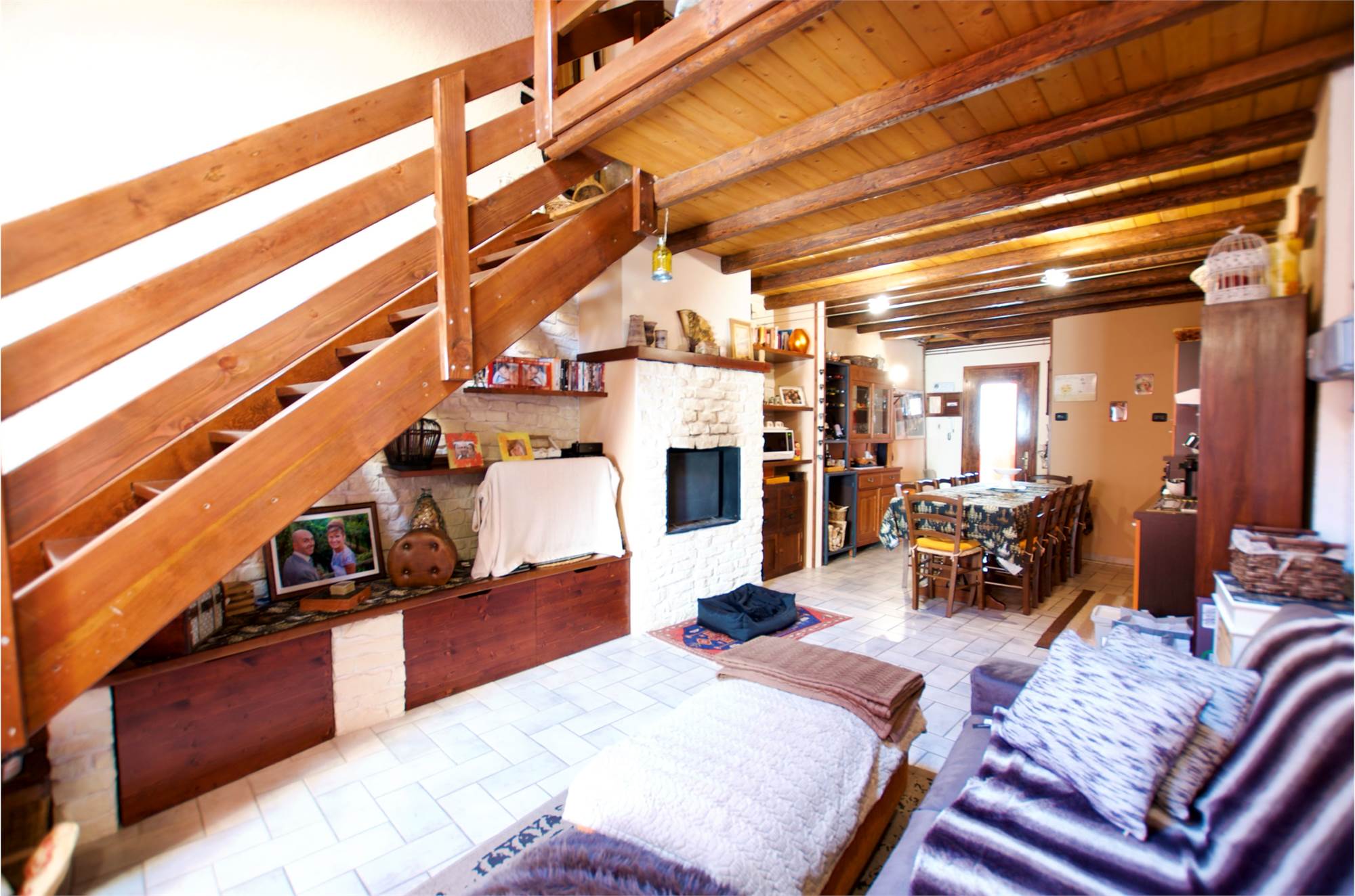 La zona giorno si sviluppa in un ampio e luminoso open space, dove cucina e soggiorno convivono in un’atmosfera accogliente e conviviale, perfetta per momenti di relax o serate in compagnia, servita da un bagno. Una scenografica scala in legno conduce al soppalco, dove si apre una zona notte dal carattere unico: due camere delimitate da eleganti pareti in legno, intime e suggestive, che esaltano l’anima storica dell’edificio.